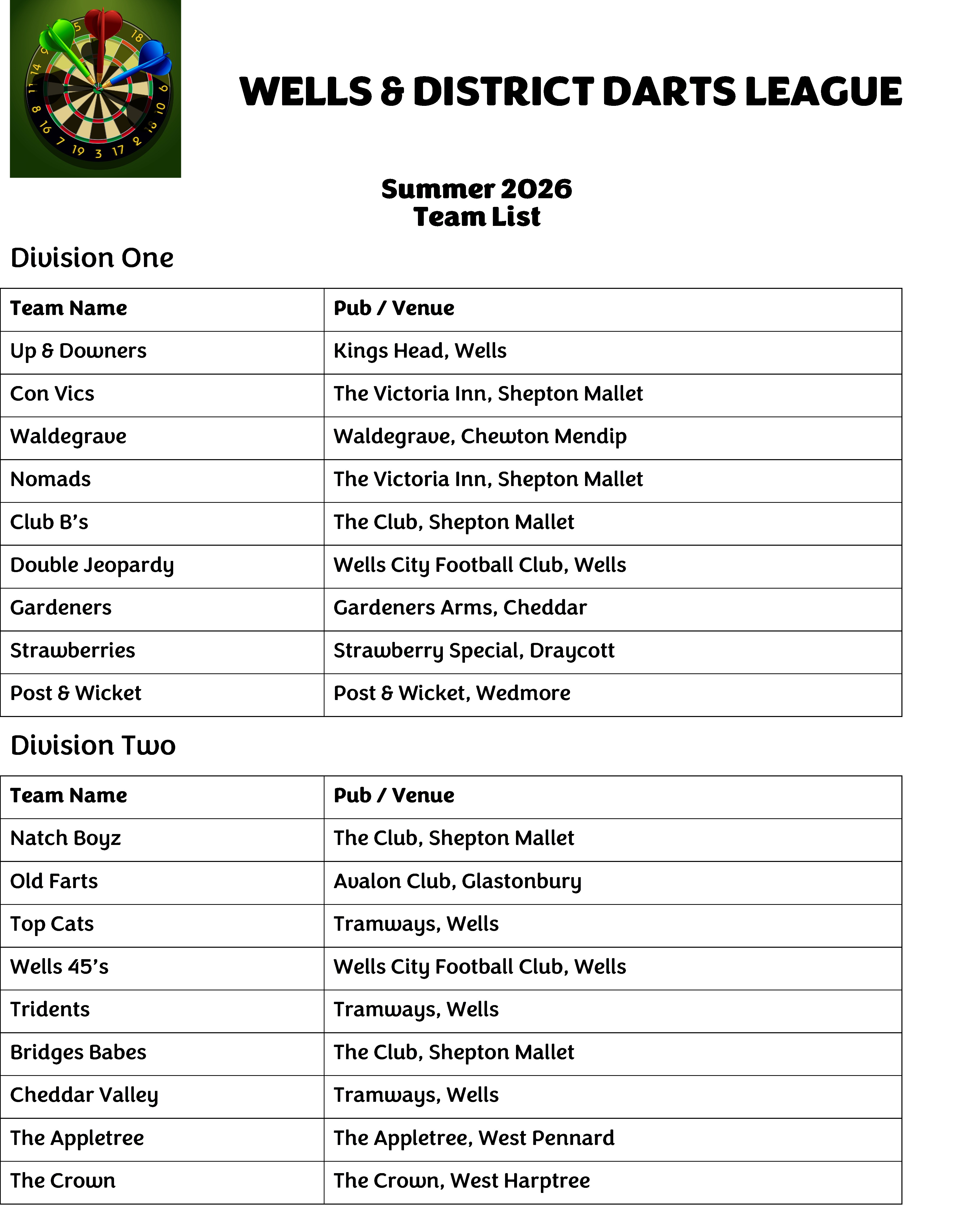 Wells & District Darts League - Teams List Summer 2026
