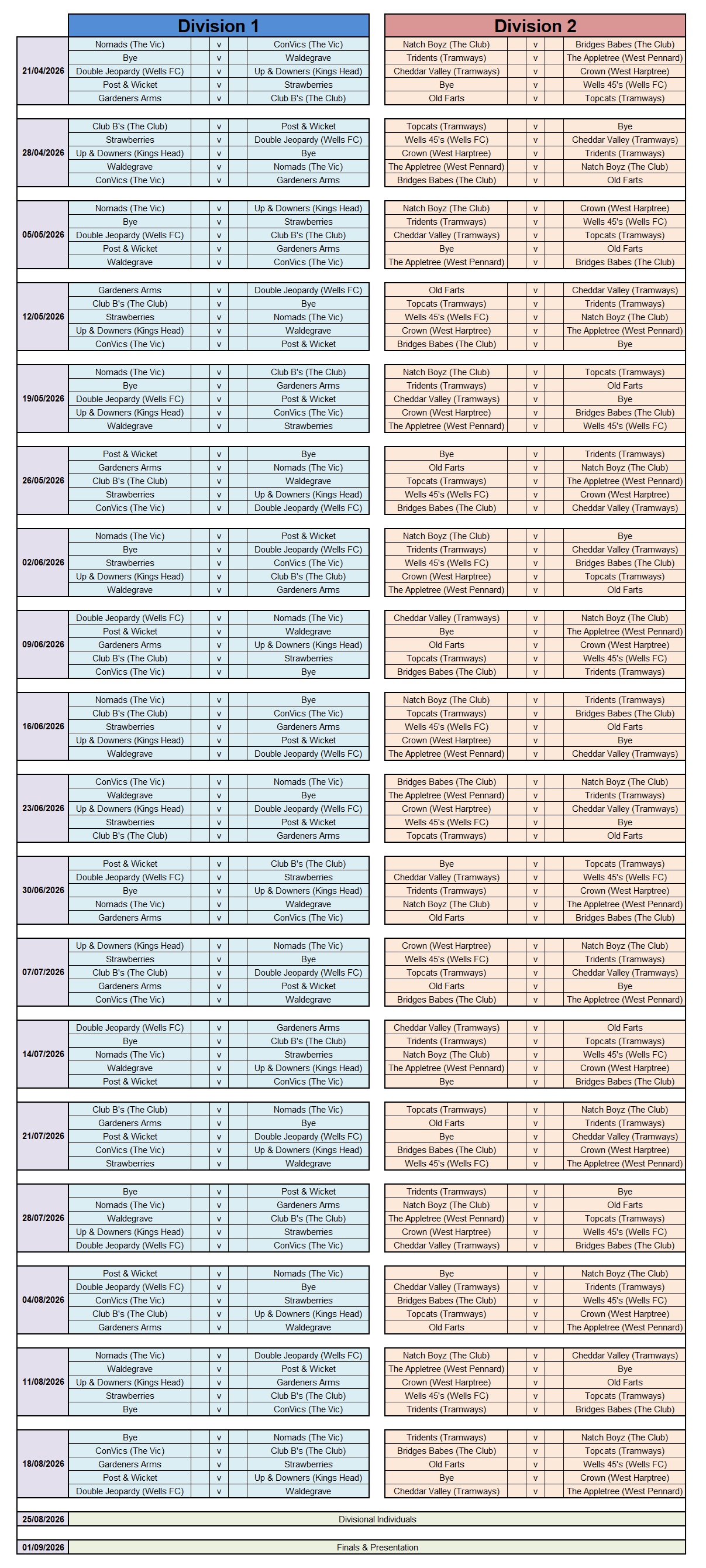 Wells & District Darts League - Fixtures & Results Sumer 2026