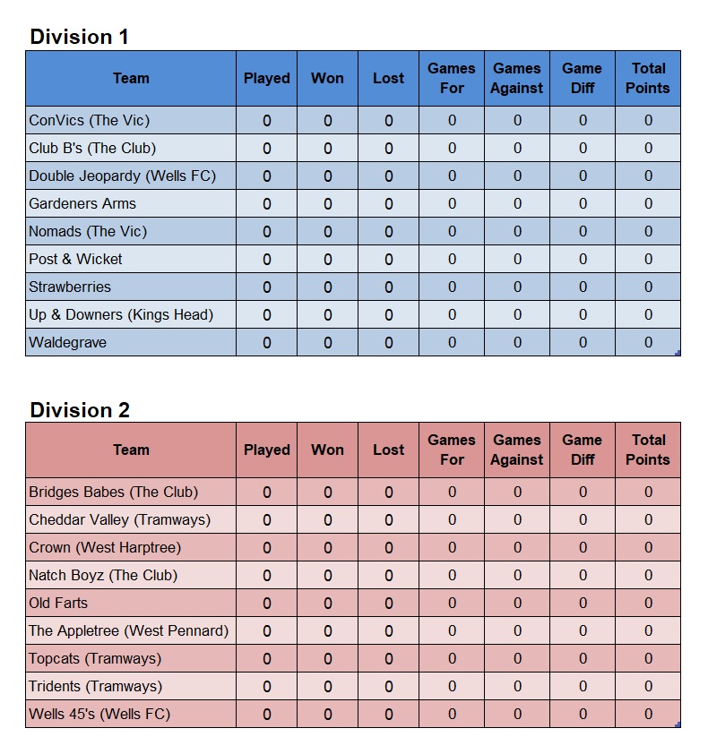 Wells & District Darts League - Summer League Tables