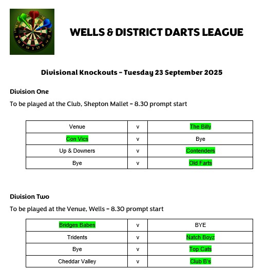 Wells & District Darts League - Divisional Knockouts