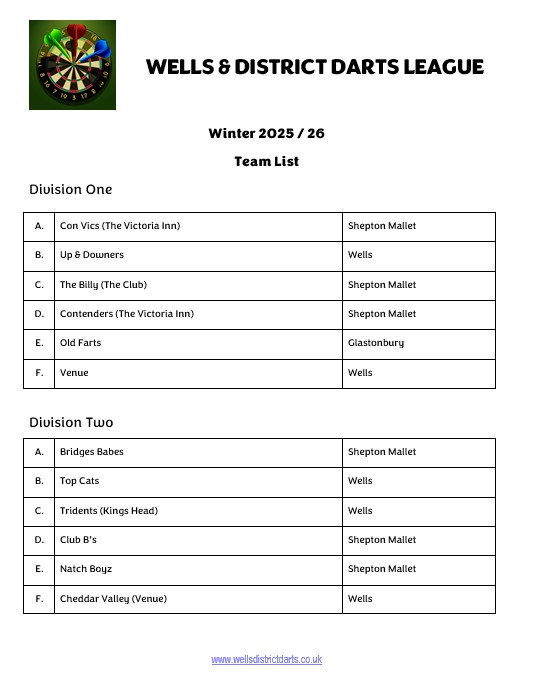 Wells & District Darts League - Teams (Winter Season 2025-26)
